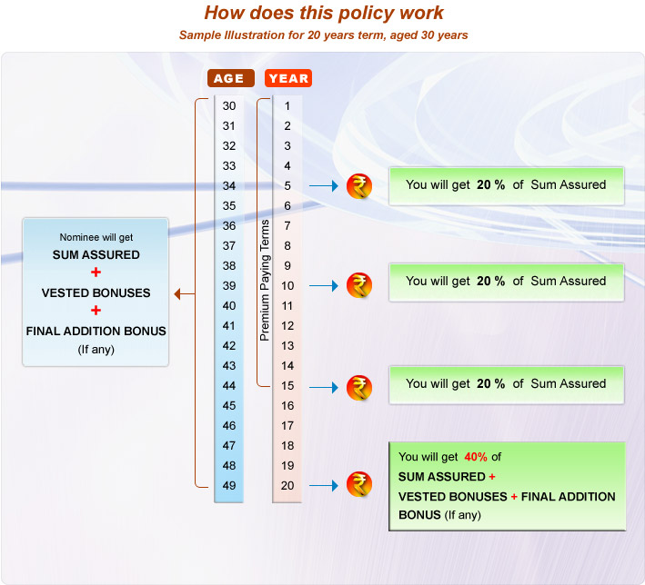 In case of Life Assured surviving to the end of the specified durations 20% of the Basic Sum Assured at the end of each of 5th, 10th & 15th policy year.